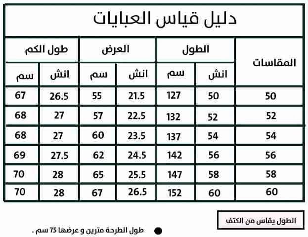 طول العباية يؤخذ من الكتف الى أسفل الكعبين (من الأمام)