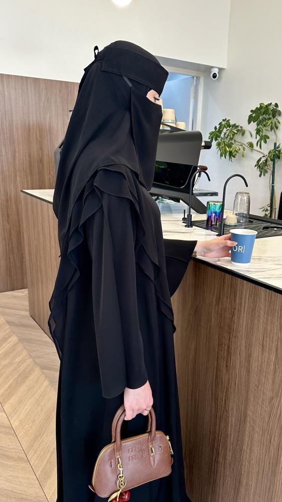 طول العباية يؤخذ من الكتف الى أسفل الكعبين (من الأمام)